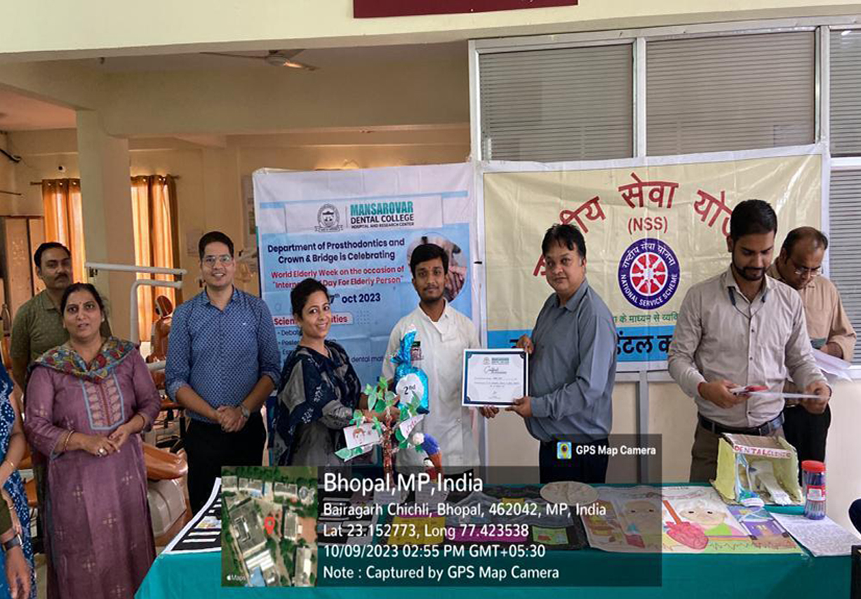 NSS unit of MDC organized an event on “International Day of Elderly Persons”. Mansarovar Dental College's Department of Prosthodontics and Crown & Bridge recently marked the International Day of Elderly Persons with a resounding success—a free denture camp that served more than 50 patients. This extraordinary event was complemented by enlightening scientific activities for our students, all made possible by the unwavering cooperation of our students and faculty.
